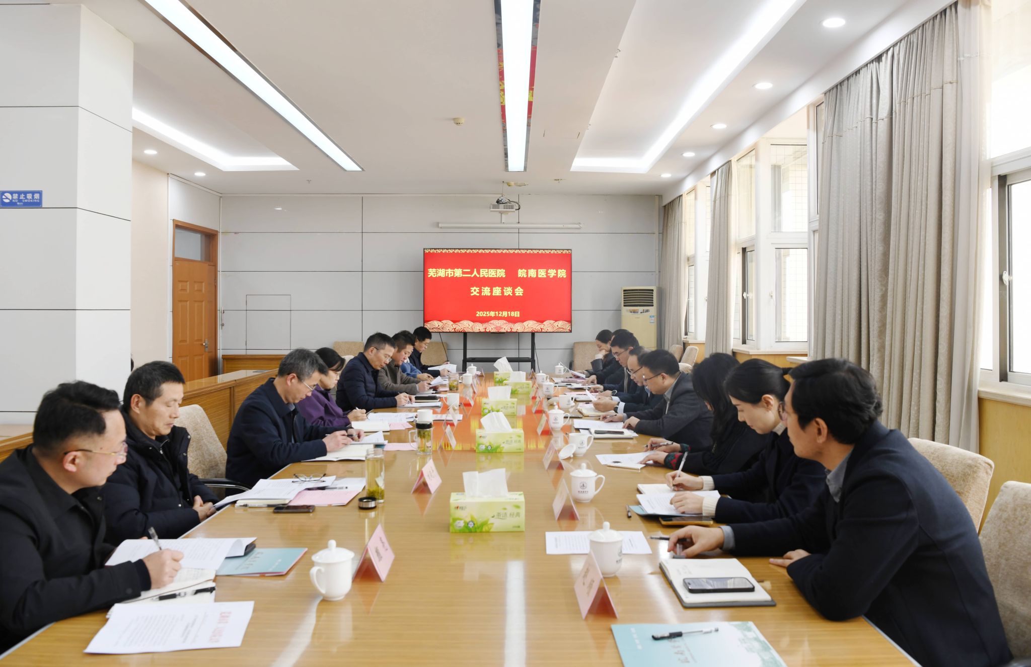 12月18日下午,芜湖市第二人民医院党委书记林丙来,党委副书记、院长姜小敢一行来校座谈交流。座谈会在滨江校区行政会议室举行,我校党委书记夏劲松,党委副书记、院长姚应水,党委常委、副院长余结根出席座谈会。会议由余结根主持。